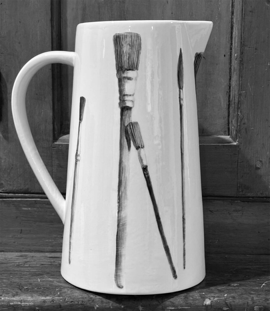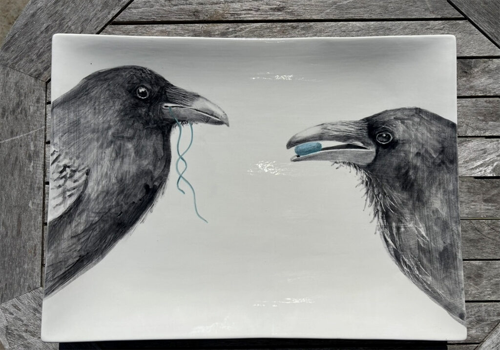 A sense of humor runs throughout her work: a pig eyeing a tempting acorn, a tall and elegant pitcher adorned with an oversized fly, or even Ruth Bader Ginsburg rendered on a platter—each piece thoughtfully designed to delight and amuse. All of her ceramic work is hand-painted.