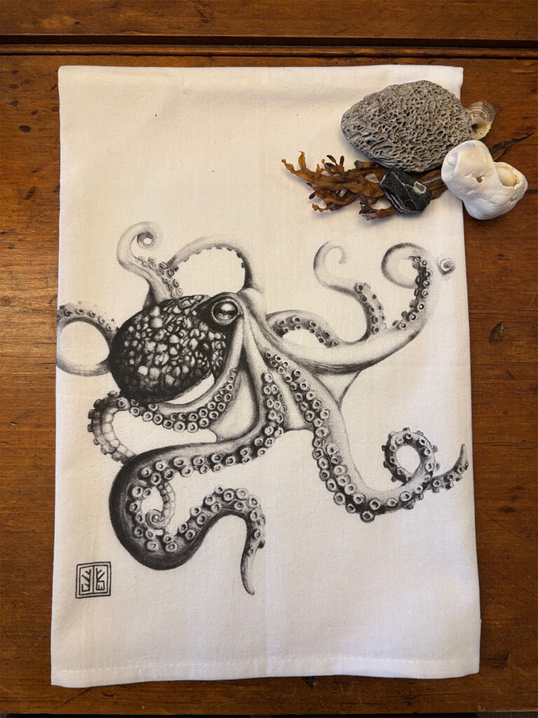 She has also expanded her practice to include illustrated tea towels, broadening the reach of her work. Printed locally on 100% cotton using environmentally friendly, water-based inks, these textiles bring her drawings into everyday life.